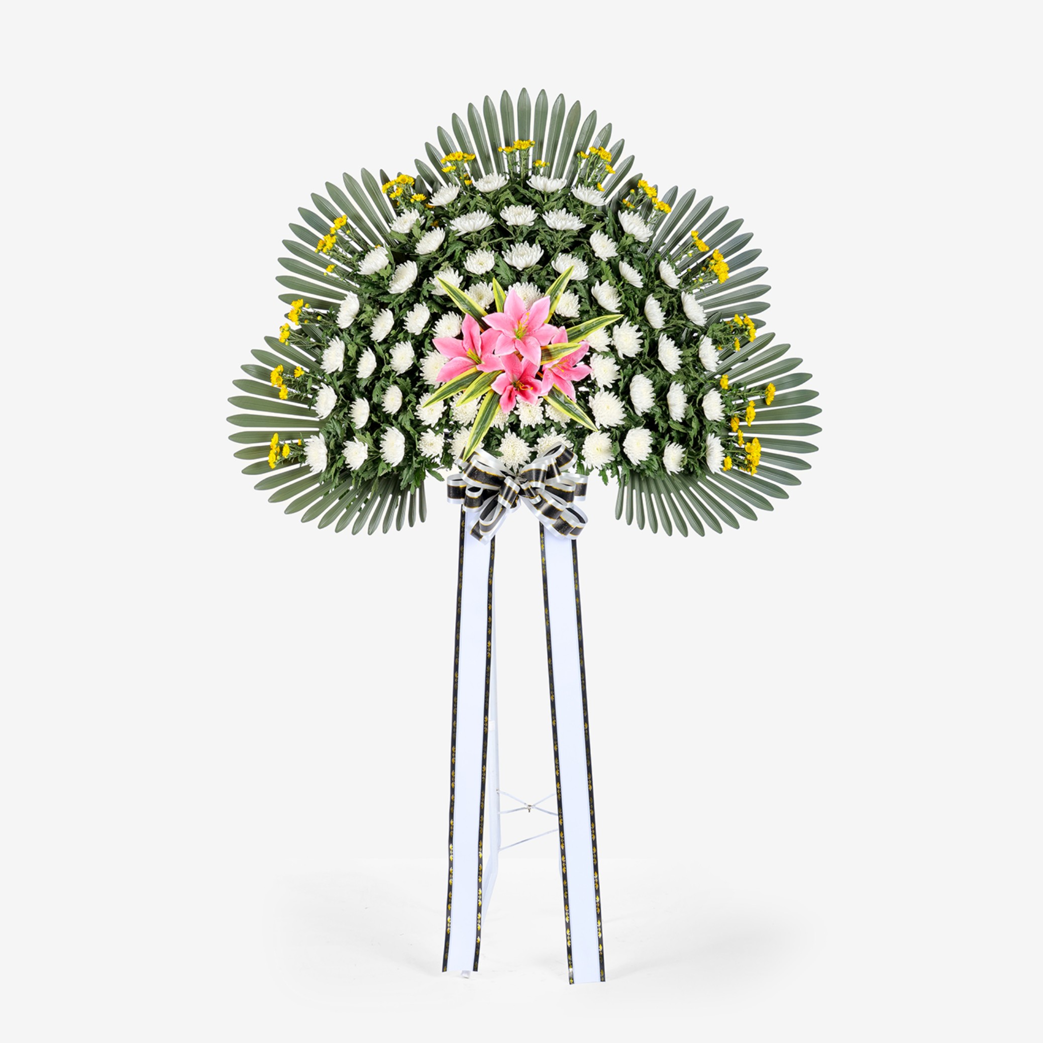 국화와 백합 등이 주요 소재로 구성된 친환경 근조 신화환입니다.